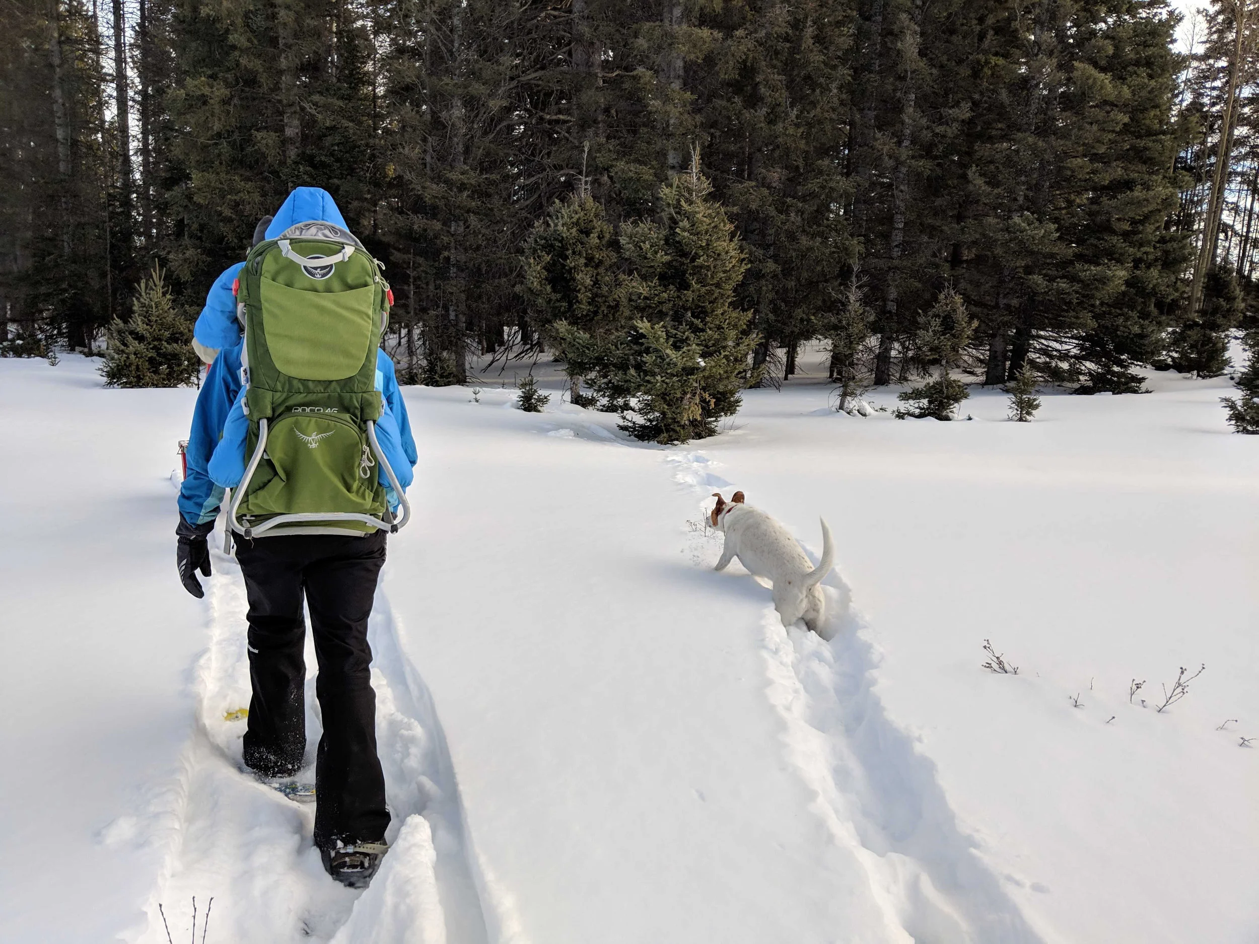 snowshoes and a backpack carrier for baby/toddler are essentials for getting around safely in the snow. Remember to size up if carrying a load in deep snow (27 inches for women/30 for men).